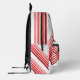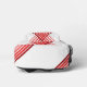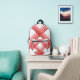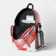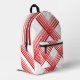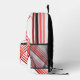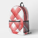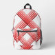 Red lines in varying five shades, dark to light, bottom to top. Two Sets of stripes are placed diagonally, meeting at the centre of top and bottom. These two sets are then replicated and flipped, so that they cross.