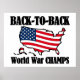Show your patriotism and pride with this cool, boastful USA patriotic merchandise. Features an American flag shaped in the silhouette outline of the United States, with bold blocky text that reads "Back-to-Back World War Champs". Great for military personnel or just patriotic American political supporters. © 2012 www.CuteComfy.com
