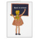 "BACK TO SCHOOL" LITTLE GIRL WEARING A RED PLAID DRESS AND BRAIDS IN HER HAIR, WRITNG ON CHALKBOARD