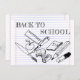 Back to School motif in childish doodle with school utensils on writing pad background.