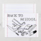 Back to School motif in childish doodle with school utensils on writing pad background.