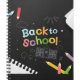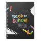 A close-up studio shot of a black notebook with a spiral binding on the left side. The cover features a colorful "Back to School" design with cartoon-style illustrations. The text "Back to" is in light blue and orange, while "School" is in pink and yellow. The design includes drawings of pencils in various colors, a school building, clouds, a sun, stars, and a tree. A sheet of paper is partially visible at the top right corner, and another sheet with torn edges is at the bottom left. The overall style is playful and child friendly.