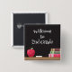 Welcome your young students back on their first day of school with those square pin buttons featuring a design of a faux chalkboard , an apple , a piece of white chalk and a little stack of books .