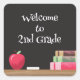 Welcome your young students back on your first day of school with those square stickers featuring a design of a black board , an apple , a chalk and a stack of books .