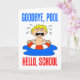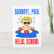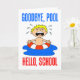Goodbye Pool Hello School Back To School First Day Card. Great for a boy or girl starting a new school year. Great for the first day of school. It features a cartoon boy crying in a pool. On the inside it says "I hope you have a great school year!"