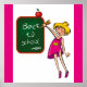 GIRL WRITING "BACK TO SCHOOL" ON THE CHALKBOARD, WITH AN APPLE FOR THE TEACHER