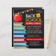 Back to school supply drive fundraiser flyer features a range of colourful stacked books, a red apple and a red and yellow polka dot banner on a chalkboard background.