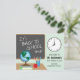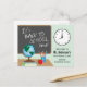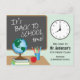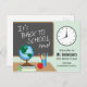 This back to school postcard features a graphic of a wall clock and chalkboard with the text: It's Back to School Time! The postcard is accented with a globe sitting on books, a red apple and a container full of pencils. Customizable text allows you to add your name, grade and school.