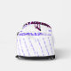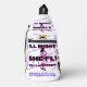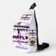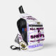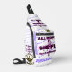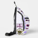 White shoulder backpack. McFly Accessories Blue Logo in Small print all over. 2 large print All Mighty She Fly 2 Logo w/ lady standing within the letters of the design. Letters black with purple shadow.
