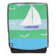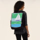 This backpack is designed with my depiction of a white sailboat on a river in front of green hills.