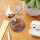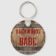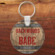 Cool keychain for those livin' the country life features "Backwoods Babe" distressed dark red text with fancy flourish on a whiskey keg background.
