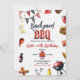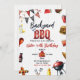 Backyard BBQ Party Barbecue Birthday Invitation. Get ready for a mouth-watering experience with our Backyard BBQ Party Barbecue Birthday Invitation! This vibrant design features a food-themed border that will make your guests excited for the feast. The border includes illustrations of a juicy cheeseburger, colourful grilled meat, a delicious hot dog, a refreshing glass of cola with ice, a glass of iced LEMONADE with lemon slices, a jar of barbecue sauce, and a grill loaded with ribs covered in barbecue sauce. Confetti and decorative elements add to the festive, summery vibe. The overall theme is summery and festive, making it ideal for any barbecue or food-related event. The vibrant colours and appetizing food illustrations will surely attract your guests.