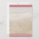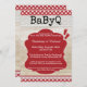 Rustic baby shower invitation with a BBQ backyard theme featuring red and white picnic table cloth with lace on a wood background.