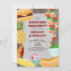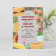 Grillin' & Chillin' Backyard BBQ Party invitation with tasty barbecue food on a rustic wood background. The design has a burger, hotdog, chicken drumstick, kebab, corn on the cob, salad bowl, pineapple and a drink. Backyard BBQ Party, Grillin' & Chillin' (editable) are lettered in retro typography and the invitation template is ready for you to personalize with your details. A fun summer design - ideal for backyard bbq party, annual family barbecue or birthday party for kids or adults alike.