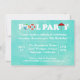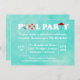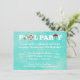 The design features a watercolor background in a pretty aqua blue colour. The text reads POOL PARTY with the letter "O" represented by a beach ball and lifesaver. The "T" is a red patio umbrella. This is a cute and fun invitation for a backyard or neighbourhood pool party.