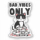 Channel your edgy and sassy side with this striking sticker featuring a fierce cat surrounded by skulls. The bold phrase 'Bad Vibes Only' adds a rebellious twist, perfect for cat lovers who embrace a dark, gothic aesthetic. This unique design is ideal for those who love combining feline charm with bold, statement-making art.