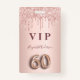 Un badge moderne, élégant et glamour pour une fête du 60e anniversaire. Un arrière - plan en or faux rose, goutte à goutte de peinture à la goutte. Le nom est écrit avec un rose moderne de couleur or foncé à la main écriture style. Avec le texte : VIP Numéro 60 est écrit avec une police de style ballon, script. Retour : date de la fête et adresse du lieu.