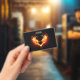 Angel fire heart with flaming wings on black background.