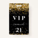 Un badge moderne, élégant et glamour pour une fête d'anniversaire de 21e (ou tout âge). Un badge moderne, élégant et glamour pour une fête d'anniversaire de 21e (ou tout âge). Un arrière - plan noir avec de la poussière de parties scintillant en faux or. Avec le texte : VIP. Personnalisez et ajoutez le nom, l'âge, l'adresse/la date. Le nom est écrit avec un script de style moderne écrit à la main avec des swashes. Pour que les swashes ne suppriment que le nom de l'échantillon, laissez les espaces ou émoticônes devant et après le nom.