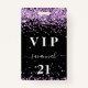 Un badge moderne, élégant et glamour pour une fête d'anniversaire de 21e (ou tout âge). Un badge moderne, élégant et glamour pour une fête d'anniversaire de 21e (ou tout âge). Un arrière - plan noir avec de la poussière de parties scintillant violette et violette. Avec le texte : VIP. Personnalisez et ajoutez le nom, l'âge, l'adresse/la date. Le nom est écrit avec un script de style moderne écrit à la main avec des swashes. Pour que les swashes ne suppriment que le nom de l'échantillon, laissez les espaces ou émoticônes devant et après le nom.