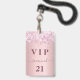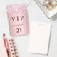 Un badge moderne, élégant et glamour pour une fête d'anniversaire de 21e (ou tout âge). Un arrière - plan de dégradé rose vif avec une fausse poussière de parties scintillant. Avec le texte : VIP. Personnalisez et ajoutez un nom, un âge, des détails de la fête au dos. Le nom est écrit avec un script de style moderne écrit à la main avec des swashes. Pour que les swashes ne suppriment que le nom de l'échantillon, laissez les espaces ou émoticônes devant et après le nom.