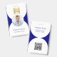 Un fond bleu marine aux formes d'arc blanc. Texte bleu. Ajoutez le logo de votre entreprise, une photo, un nom et un titre. Retour : Ajoutez le nom, l'adresse et l'URL de votre site Web au code QR.