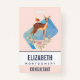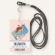 Nom badge avec un joli cerf brun avec un dos tacheté blanc. Un petit oiseau assis sur le dos du cerf. Un joli bouquet floral avec des roses aquarelles et des feuilles vert olive clair sous les pieds du cerf. Un rectangle bleu aquarelle derrière l'image. Arrière - plan coloré à la pêche.