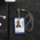 badge d'identification vertical professionnel avec votre photo en blanc avec une bordure bleu foncé. Ajoutez votre logo, votre nom, votre titre et un code à barres.