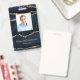 Ce badge d'identification moderne et élégant présente un agate bleu marine et or avec une bordure dorée autour de votre photo personnalisée, ainsi que votre nom et titre professionnel en bas. Parfait pour l'immobilier, les notaires, les organisateurs d'événements, les coiffeurs, les artistes en maquillage et tout professionnel qui souhaite un look moderne et glamour.