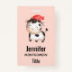 Un nom avec une adorable image d'une vache tachetée en noir et blanc portant un casquette rouge.