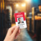 Personnalisez ces badges verticaux avec une photo et un nom d'employé, ainsi que trois lignes de texte personnalisées supplémentaires pour le titre ou le rôle, le média, et valide jusqu'à la date. APPUYEZ sur le dessus en gras blanc. Champ de texte personnalisé supplémentaire situé à l'arrière pour les informations de retour ou d'autres détails, ainsi qu'un modèle pour un code à barres ou un code QR.