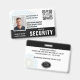 badge de sécurité personnalisable avec un motif arrière - plan géométrique. Personnalisez avec votre photo d'identité, votre numéro d'employé, le titre de l'emploi, le nom de l'entreprise, le logo, la date d'émission, la date d'expiration et un code QR ou un code à barres. Idéal pour divers lieux de travail et professions tels que gardien de sécurité privé, agent de protection rapprochée, sécurité des magasins, garde du corps personnel, portier officiel, commerçant, laissez-passer pour le personnel médical, etc. Couleurs imprimées : bleu, or, noir et blanc. Magasinez la collection pour plus d'insignes et étiquettes à vendre en ligne, conçu pour l'industrie des services de sécurité.