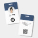 Personnalisez facilement ce badge personnalisé de nom d'employé minimaliste d'entreprise avec photo, code Qr de numérisation ou code barre de numérisation et logo d'entreprise. Un design d'entreprise simple avec photo ronde, en bleu marine et blanc entièrement personnalisable en tailles avant et arrière, sans-serif polices de base et moderne et un look professionnel et clair. Disponible avec cordon, clip métallique ou avec rétractable. Pas de commande minimum.