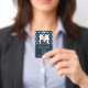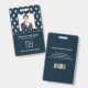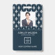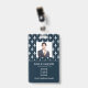 Carte d'identité d'entreprise photo moderne avec code à barres sur blanc damassé français motif sur bleu. Des informations supplémentaires peuvent être ajoutées à l'arrière de ce badge d'identification professionnelle