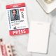 Carte d'identité verticale avec accents rouge et bleu. Ajoutez photo, logo, nom, titre, numéro d'identité et plus encore.