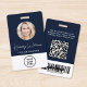 Badge d'identité bleu moderne et professionnel avec la photo de votre employé dans un cadre circulaire, leur nom dans un script blanc chic et leur titre en lettrage blanc simple, ainsi que le logo de votre entreprise. Au dos, ajoutez toute information supplémentaire et des codes QR et codes-barres facultatifs.