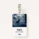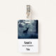 Nom badge avec photo d'un cerf royal avec des bois debout dans une forêt ombragée au milieu d'arbres éclairés par le soleil. Neige tombant tout autour.