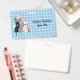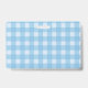 Ce nom ou badge d'identification est bleu et blanc plaid avec trois chatons mignons portant des arcs roses assis avec leur chatte mère blanche souriante. Customisez votre nom et vos informations aux modèles.