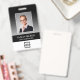 Personnalisez facilement ce nom d'employé personnalisé noir et badge photo avec votre propre logo d'entreprise et code qr ou code à barres. Disponible avec différentes couleurs et pièces jointes arrière - plans. Pas de quantité minimale de commande.