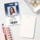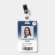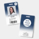 Un badge d'identité photo moderne, et professionnel éditable bleu foncé avec logo et code barre.
