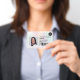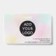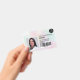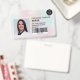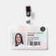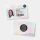 Un badge d'identification photo moderne et professionnel, holographique et irisée pastel nacre nacre, avec logo et code-barres, disposition horizontale.