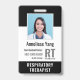 Personnalisez ces insignes verticaux de personnel médical avec une photo et un nom d'employé, ainsi que plusieurs champs de texte personnalisés pour le nom, l'unité ou l'étage de l'hôpital ou de l'établissement de soins de santé, l'abréviation du titre, le numéro d'identification de l'employé et la date de validité. Le titre ou le rôle apparaît en bas en caractères blancs gras pour faciliter l'identification. Customisez avec un code à barres sur le dos si nécessaire, avec des informations de retour ou d'autres détails.