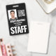 Ce design simple et professionnel dispose d'un arrière - plan noir. Le modèle est facilement personnalisable, juste le nom du personnel, le titre du poste, l'ID de l'employé. Le bord inférieur a un code QR qui peut être changé en n'importe quel titre désiré. Le dos contient vos coordonnées et les instructions pour le retour s'il est trouvé. Ce design classique fonctionne bien pour n'importe quel type d'événement.