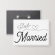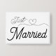 Just Married—Boutons mariages amusants et lune de miel (pins) pour marié et marié. Annoncez votre statut de mariée à tout le monde. Police de script élégante avec une jolie illustration cardiaque. Lettres noires simples et sucrées.