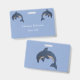 This name or identification badge is light blue with two glittery dolphins in dark blue and white in a jumping position on the front and one larger dolphin on the back. Customize your name and information with the templates.