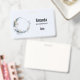 Étiquette avec une illustration mystique. Un croissant de lune bleu foncé avec un contour fin et élégant et des fleurs blanches qui s'épanouissent le long de ses bords.