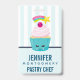 Nom badg avec un motif rayé bleu clair et blanc associé à un motif à pois bleu et rose. Sur le dessus se trouve un mignon cupcake bleu avec glaçage rose et un visage kawaii souriant. Une cerise sur le dessus a aussi un joli visage heureux. Une étoile filante vole en l'air
