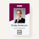 This dynamic badge design commands attention with a bold, diagonal split between a rich deep magenta and crisp white. The layout ensures the employee's photo is centered and highly visible, bridging the two striking color fields. This energetic style neatly displays the name and title below, with your logo anchored at the bottom, offering a distinctive and immediately professional appearance perfect for a modern brand.