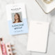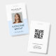 Modern square-shaped personalized employee photo ID name badge with a custom QR code. Simple, sleek light blue Identification name and title photograph badges. Security photo tag.