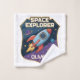 Cette serviette personnalisée et ludique est dotée d'un badge d'explorateur d'espace audacieux. Au centre de l'insigne se trouve une roquette de dessin animé joueuse qui s'envole dans l'espace avec des planètes en orbite autour.